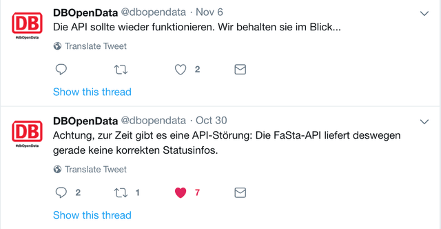Roughly translated: The Tweet at the bottom notifies about an outage of the FaSta API. The Tweet above announces the issue has been resolved. So outages do happen and we also have some sort of indication about their duration (this was a major outage). We will use these dates later (30th Oct. to 6th Nov.) to check if we identified the outage correctly.