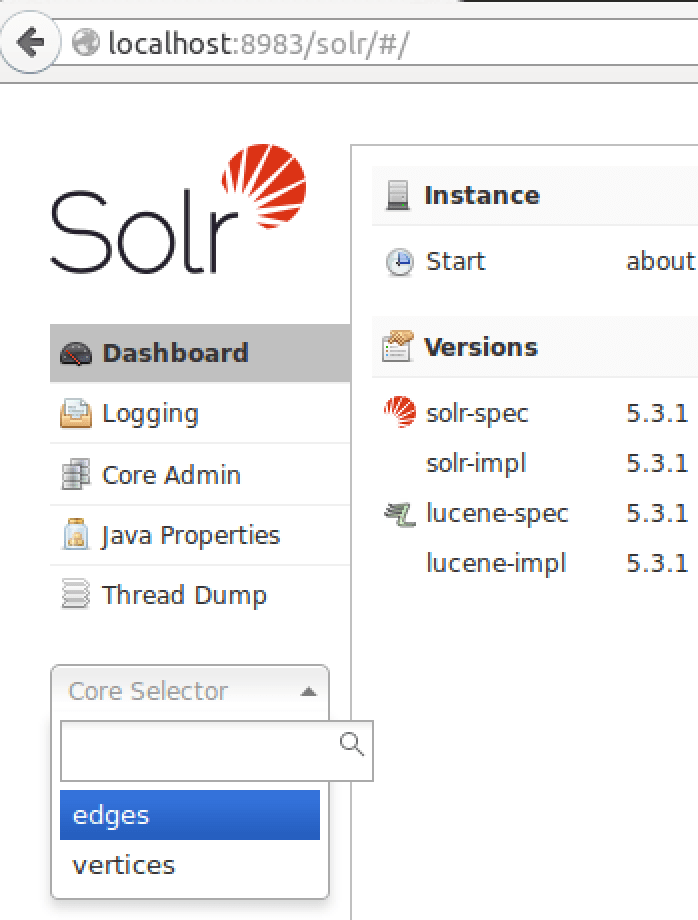 To validate that Solr is running, point your browser to http://localhost:8983/solr/#/