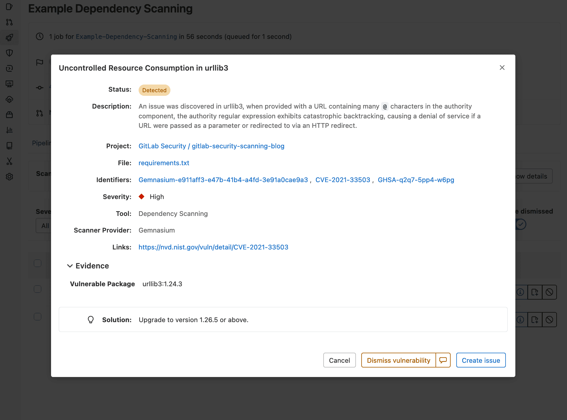 After the pipeline has been successfully completed, all findings can be viewed and evaluated on the security tab of the pipeline page. Vulnerabilities can either be dismissed or followed up and finally mitigated with the help of GitLab issues: