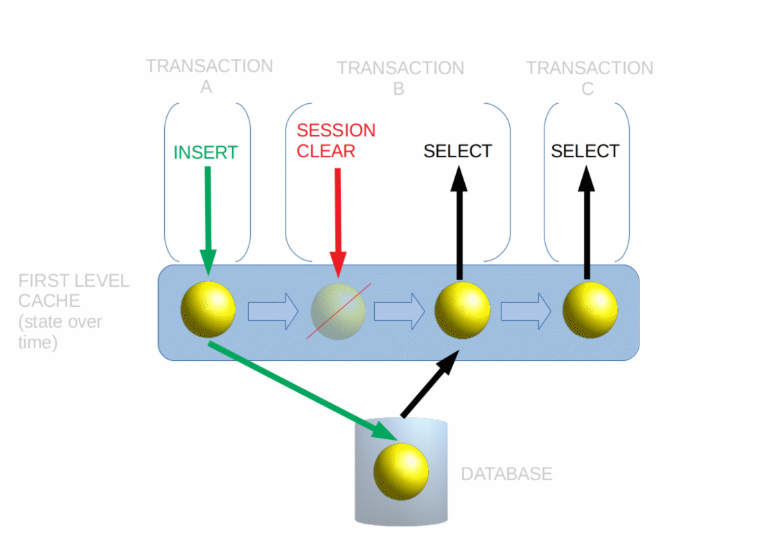 Since we now start with an empty session and our test is loading the entity explicitly, one SELECT query is intended. This operation also puts the entity right back into the first-level cache (session cache). After committing (Transaction B), another Transaction (Transaction C) is accessing the entity again by its identifier. This call should be answered by the first-level cache, so we expect no further SELECT query although we are in another transaction context.