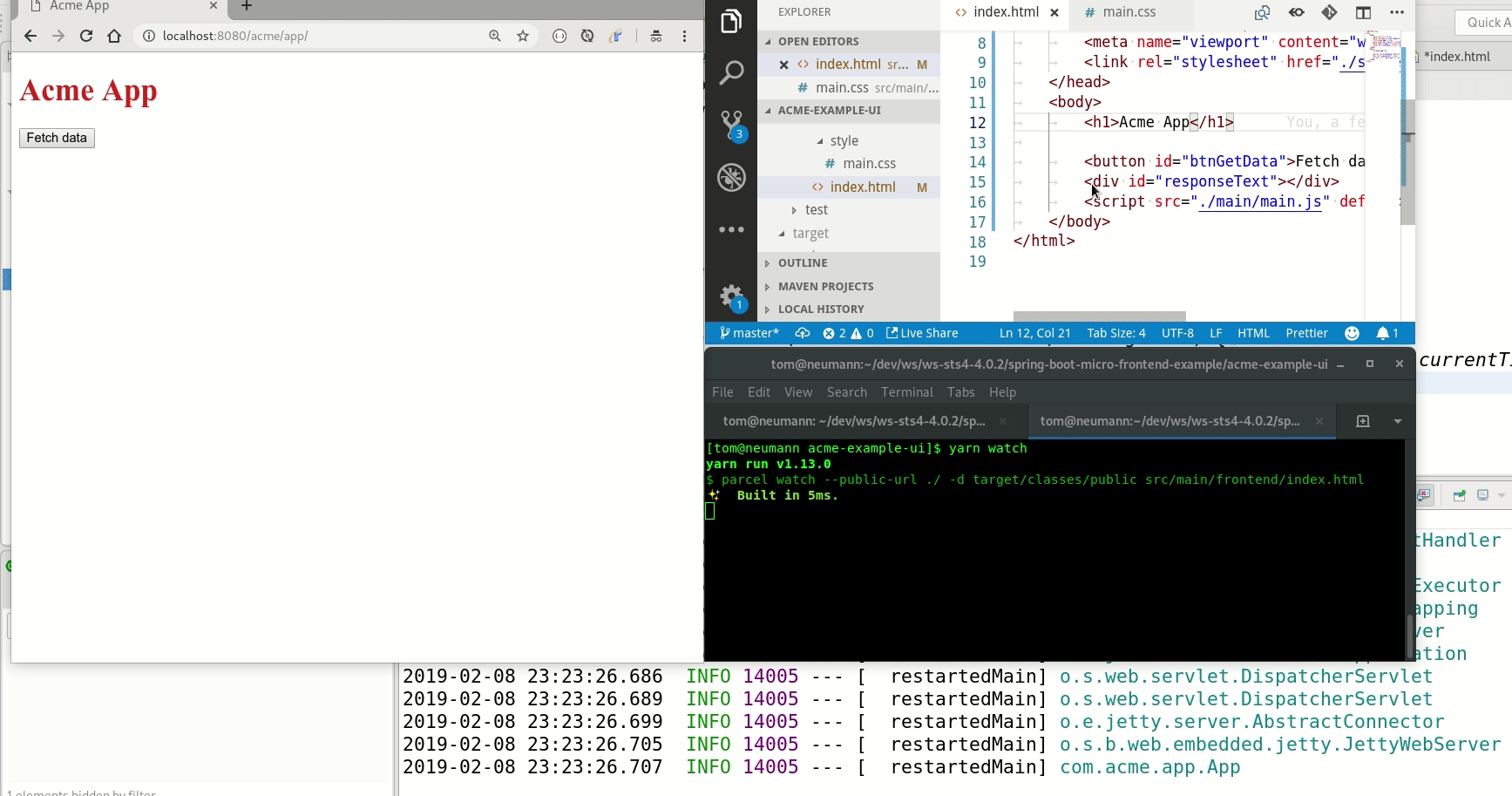 The first module is acme-example-api, which contains the backend API which, in turn, is just a simple @RestController annotated Spring MVC Controller. Our second module acme-example-ui contains our frontend code and uses Maven in combination with Parcel to package the application bits. The next module acme-example-app hosts the actual Spring Boot app and wires the two other modules together. Finally, the spring-boot-starter-parent module serves as an aggregator module and provides default configuration.