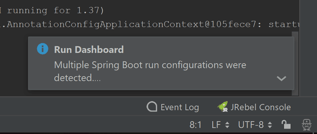 The good part is, IDEA has added automatic detection for Spring Boot applications. For example, if you create a new application or import an existing application, IntelliJ will use a notification prompting you to add the Spring Boot configuration to the Run Dashboard.
