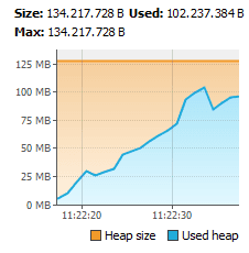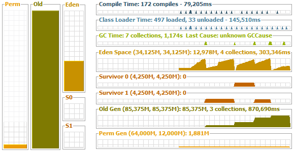 Lots of numbers, all in kilobytes. Survivor Spaces are 2MB each, Eden is 16MB, Old is 40MB, Perm is 55MB. This comes close to the overall memory consumption of 135MB. The gap are the non heap memory areas.