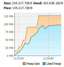 Below are two graphs of the heap consumption monitored by VisualVM. The yellow area shows the available memory while the blue area shows the currently used memory. The graph sometimes decreases, because garbage collection frees some temporary objects used to increase the ArrayList size. The graph on the left hand side results from the application using the default settings of the JVM. You can clearly see that initially the JVM uses very few system resources and then starts to request more memory from the operating system as it is needed, finally ending at 128 megabytes. In the graph on the right hand side we see that the yellow area already covers 128MB from the start. This is because I added a JVM flag to change the default behavior. I will show you the flags in a second.