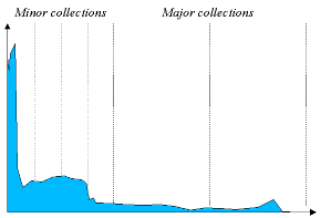 The Young area usually shows a lot of activity, so most garbage collection algorithms are designed to optimize collections in that area. The graph on the right hand side (taken from Oracle documentation ) shows how the age of objects is typically distributed. While most objects only live for a short time, there are also quite a few objects that stay alive a bit longer than 2-3 Young generation garbage collections (called minor collections). So the Young collection will be performed by saving the ones that survive in so-called survivor spaces. Objects stay in the survivor spaces until they have survived long enough to be promoted into the Old generation. Due to the way GC works, two Survivor Spaces are used and one of them is always empty. The remaining part of the Young generation is called Eden.