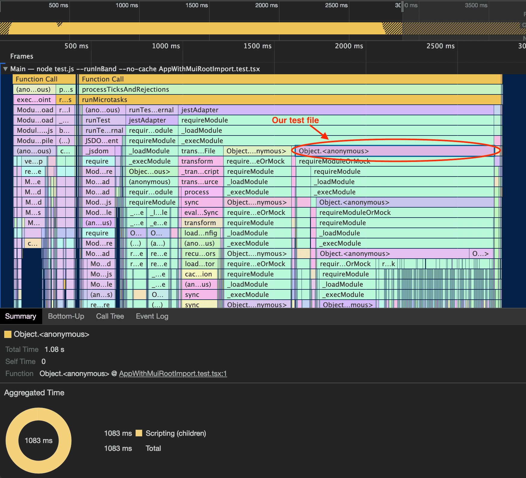 In this case we see an immediate increase in test execution time from 1.7 to 2.7 seconds. The actual test file (AppWithMuiRootImport.test.tsx