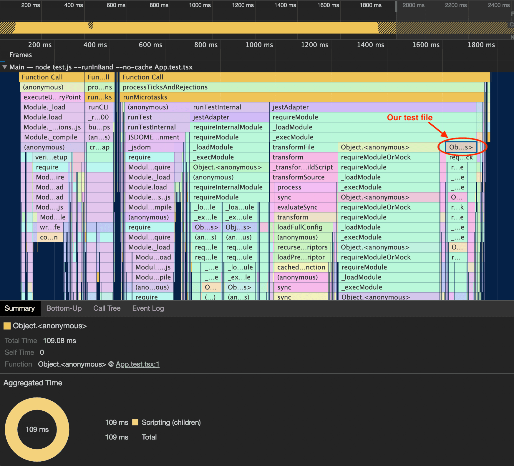 However, we can immediately see some interesting results from this benchmark test. Although the total test time was 1.7 seconds, only 109 ms was required for the actual test file (App.test.tsx