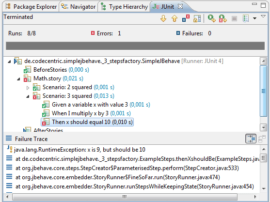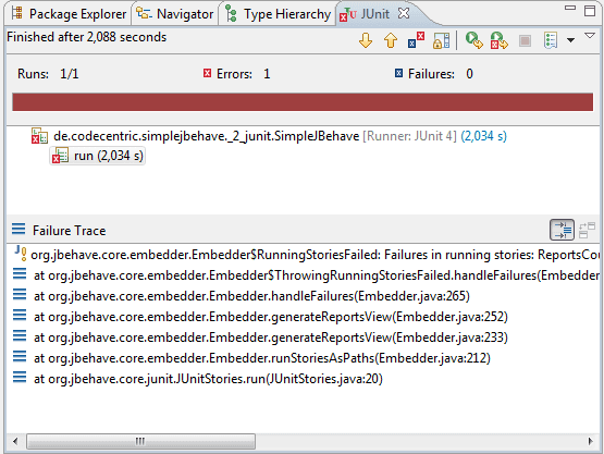 1Processing system properties {} 2Using controls EmbedderControls[batch=false,skip=false,generateViewAfterStories=true,ignoreFailureInStories=false,ignoreFailureInView=false,verboseFailures=false,verboseFiltering=false,storyTimeoutInSecs=300,threads=1] 3Running story de/codecentric/simplejbehave/Math.story 4Generating reports view to 'C:\cc\workspace-git\SimpleJBehave\target\jbehave' using formats '[]' and view properties '{defaultFormats=stats, decorateNonHtml=true, viewDirectory=view, decorated=ftl/jbehave-report-decorated.ftl, reports=ftl/jbehave-reports-with-totals.ftl, maps=ftl/jbehave-maps.ftl, navigator=ftl/jbehave-navigator.ftl, views=ftl/jbehave-views.ftl, nonDecorated=ftl/jbehave-report-non-decorated.ftl}' 5Reports view generated with 1 stories (of which 0 pending) containing 2 scenarios (of which 0 pending) 6Exception in thread "main" org.jbehave.core.embedder.Embedder$RunningStoriesFailed: Failures in running stories: ReportsCount[stories=1,storiesNotAllowed=0,storiesPending=0,scenarios=2,scenariosFailed=1,scenariosNotAllowed=0,scenariosPending=0,stepsFailed=1] 7 at org.jbehave.core.embedder.Embedder$ThrowingRunningStoriesFailed.handleFailures(Embedder.java:499) 8 at org.jbehave.core.embedder.Embedder.handleFailures(Embedder.java:265) 9 at org.jbehave.core.embedder.Embedder.generateReportsView(Embedder.java:252) 10 at org.jbehave.core.embedder.Embedder.generateReportsView(Embedder.java:233) 11 at org.jbehave.core.embedder.Embedder.runStoriesAsPaths(Embedder.java:212) 12 at de.codecentric.simplejbehave._1_kiss.SimpleJBehave.main(SimpleJBehave.java:16)