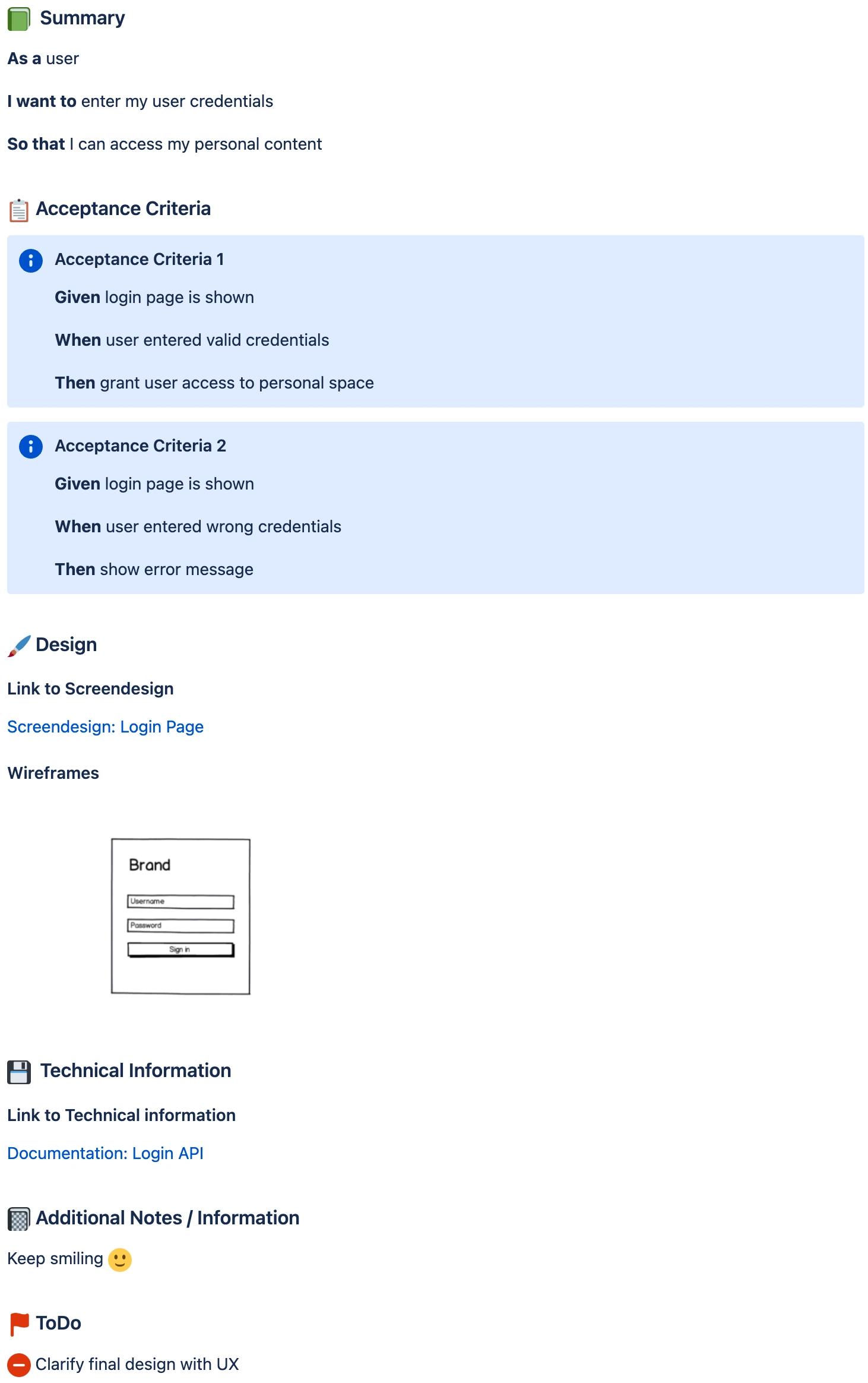 Next to the user story template I also like to use templates for tasks and bugs. For bugs, using of a common template is obligatory since it guarantees that all information is collected upon ticket creation. This helps reproduce the issue.