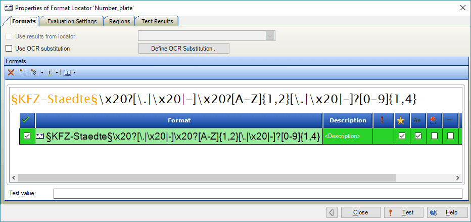 However, this regular expression may find also strings that are not valid, since only one to three letters are searched at the front. It would be nice, if one could use a list of valid city codes instead of [A-ZÄÖÜ]{1,3}. By doing so, the list of recognized, but invalid number plates would become much smaller. KTM dictionaries come in handy there. Lists of valid city codes are available in the Internet and a suitable dictionary file (KFZ-Staedte) with the valid codes is created quickly: