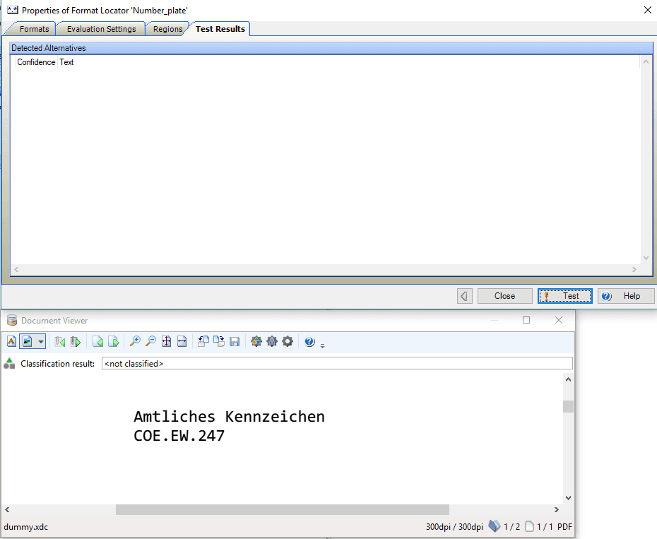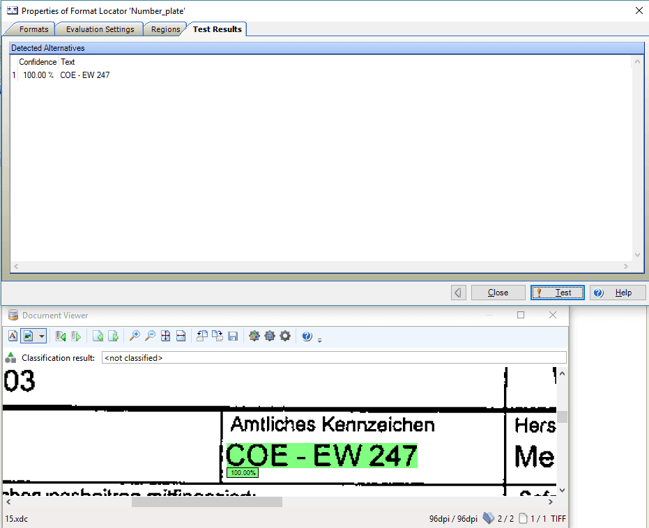 This is the case with the first example: “COE – EW 247”. The second example “COE.EW.247” has points as a separator between the individual parts of the number plate and the integration of the dictionary does not work as desired.