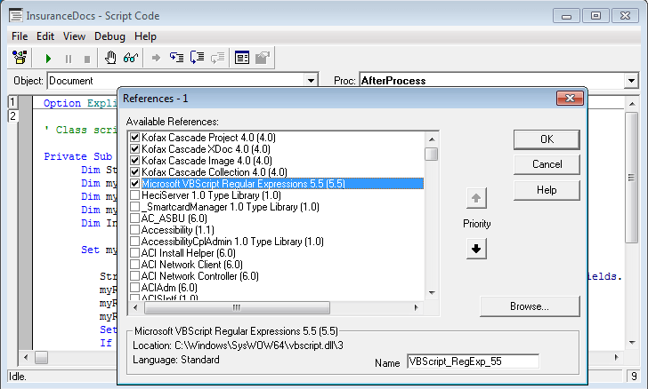 First of all the library ‘Microsoft VBScript Regular Expressions 5.5’ has to be added as reference to the script: