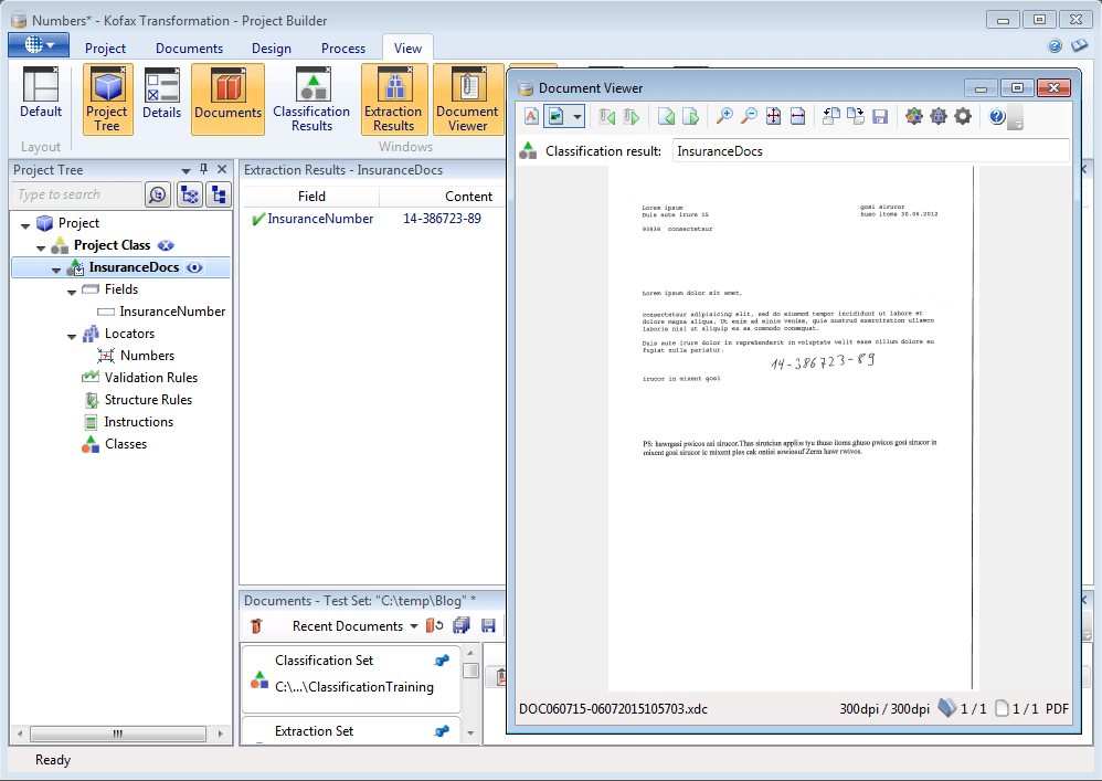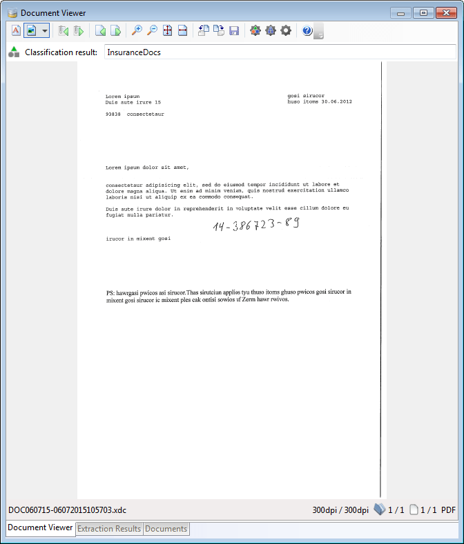 Within the KTM project you first have to classify the example document to the appropriate document class (in our example to the class ‘InsuranceDocs’). This can be done with any of the available KTM classification methods (see also: Document classification with KTM ).