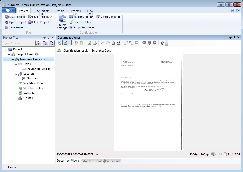 A field ‘InsuranceNumber’ and a locator ‘Numbers’ (Advanced Zone Locator) should be added to the document class ‘InsuranceDocs’: