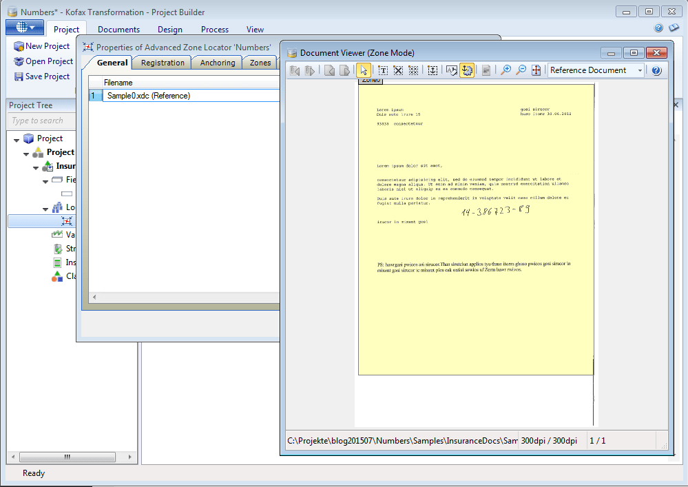 In this example we are searching handwritten insurance numbers on a document. These numbers have the following structure: 1x-xxxxxx-xx. The x represents a character between 0 and 9, example: 14-386723-89.