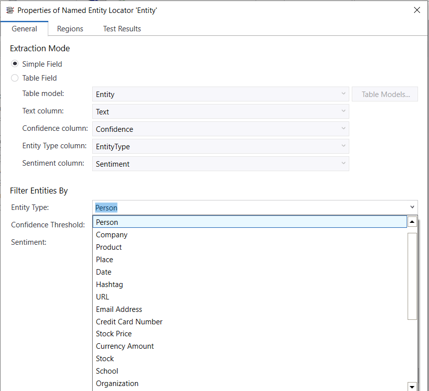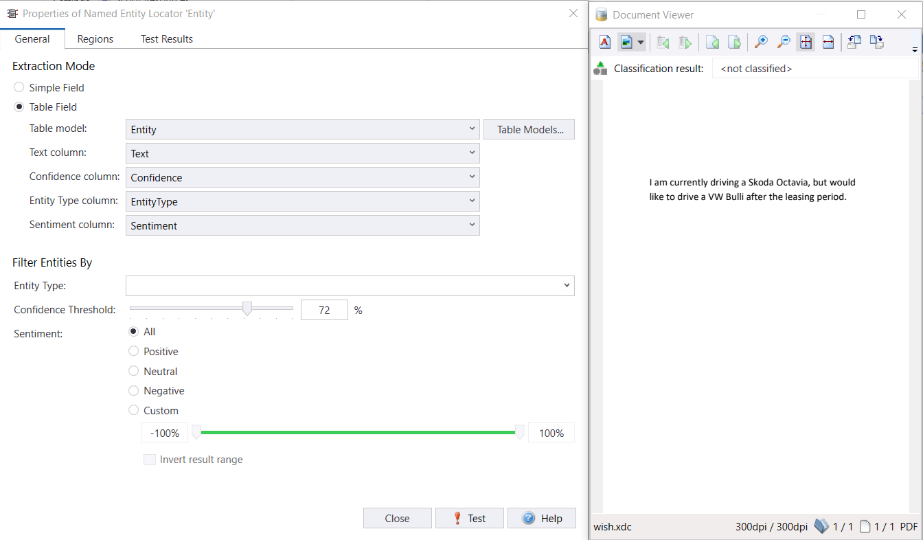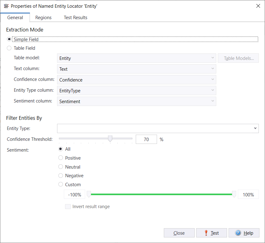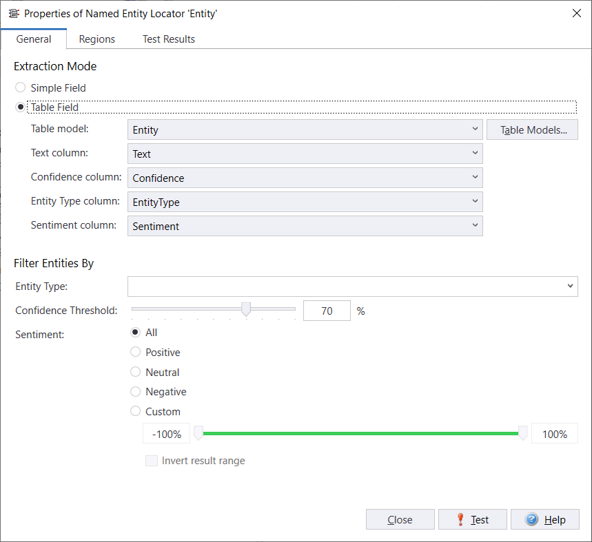 Before using this mode, you first have to create a simple table model (the same models as when using the table locator). I named the columns just Text, Confidence, EntityType and Sentiment and the tabel model is named Entity. This mode delivers the most meaningful results: