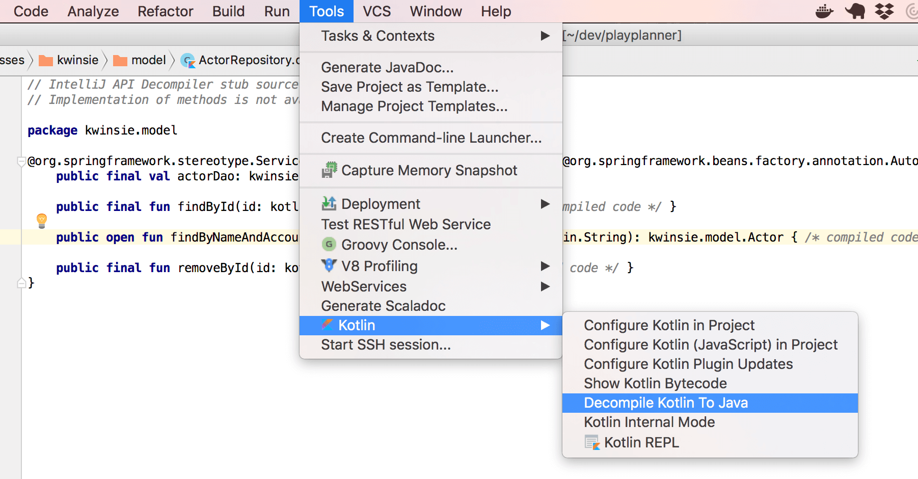 There is zero code duplication, an no boilerplate! This is actual code from my open source project kwinsie , by the way. Every wondered what it would look like in plain old Java? Just load the generated class file and decompile it. Just in case you’re wondering: the Actors are not Akka actors, but theatre actors, from my hobby project kwinsie.com.