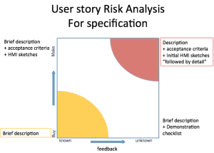 – A build component that is not know enough for the development team. Then it’s wise to give a description of the user story + flow. Together with an initial HMI sketch. It is initial on purpose because there is a need for some prototyping / a couple whiteboard session or clickable prototypes to get the user story clear. This does not mean that if it’s unknown to the development team, there is more need for “detailed” specification. Interactive sessions result in more domain knowledge for the development team and probably ending up with some new requirements.