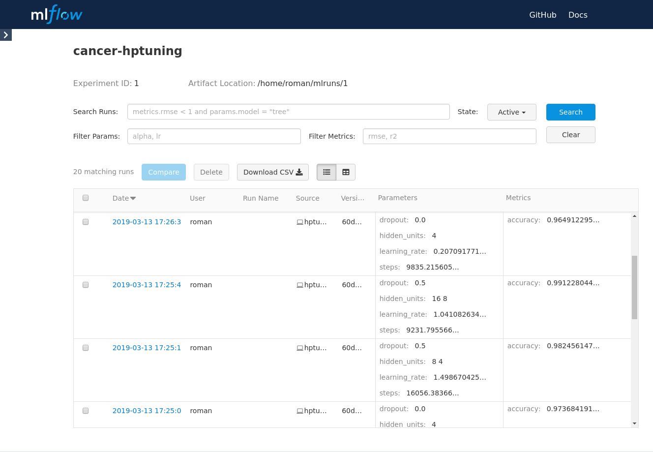 Tracking Experiments – Storing the model code, hyperparameters, and result metrics of every experiment is important to be able to discuss results, decide in which direction to go next or reproduce experiments. The simplest format for this could be a shared spreadsheet, but more sophisticated options are available – though they often come with additional requirements for the rest of the pipeline. As an example, here is a screenshot from MLflow `s experiment tracking server UI: