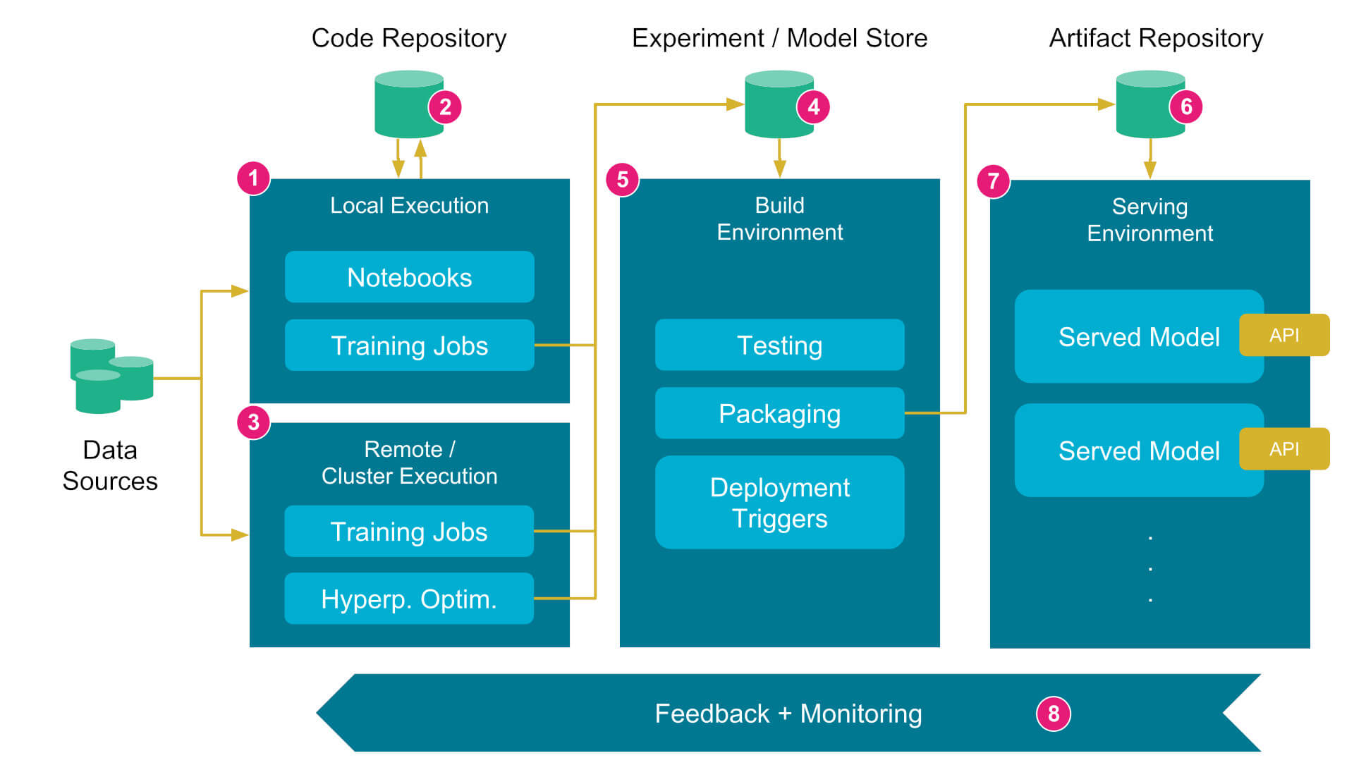All completed training jobs push the trained model along with performance metrics, used hyperparameters, dataset information, and the code revision/commit hash into a separate store (4). This store should make searching and comparing different models as easy as possible. If an organization has distinct scientist and engineer roles, this store could function as a clear interface between them.