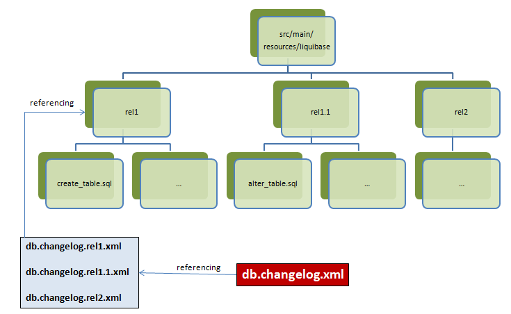Obviously it would make sense to better group files belonging to one database-release. Therefore the corresponding SQL-files should be stored to subdirectories that are named related to the releases. Luckily Liquibase also supports this in its Changelog-file by offering the possibility to include Changelog-files again to some kind of parent Changelog-file.