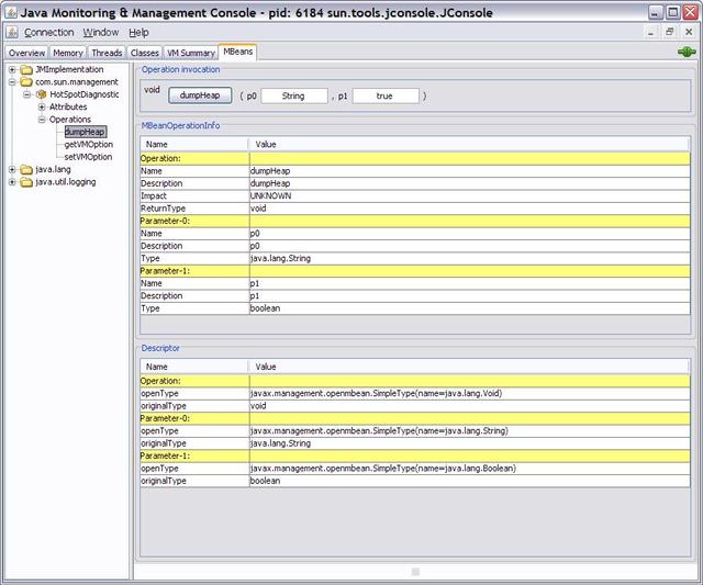 With Java 6, Sun introduced a JMX MBean which provides methods for generating a heapdump. To create a heapdump via JMX you first start the integrated JMX console with the command jconsole and connect it to the corresponding JVM. For a local connection you don’t need any additional configuration of the JVM – for a connection to a remote machine you have to configure JMX correctly.