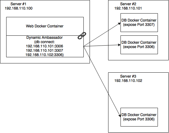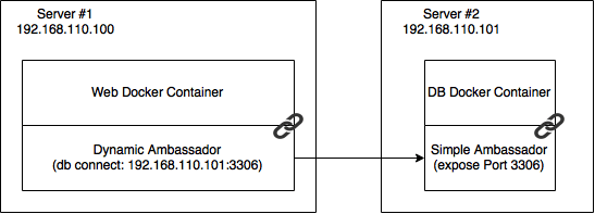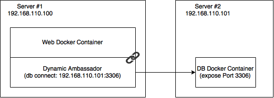 To realize the communication across hosts in a dynamic environment, you can apply the ambassador pattern. The needed flexibility is realized with two changes. First we add two extra containers to delegate the network communication to these containers. The second change is, that these containers are able to change their configuration during runtime. The original containers are linked to the ambassador containers. I do not want to get into more details about the original pattern, but explain my modifications.