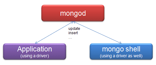 There are three processes shown in the above figure. One is the mongod-process which is the MongoDB database server process. Then there is an Application shown that acts as an example for any application using MongoDB and there is the mongo shell, which is in principle also an application using MongoDB. All of those might be running on the same or on different machines.