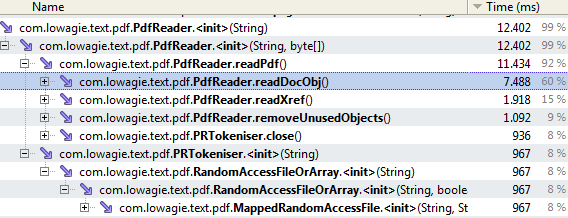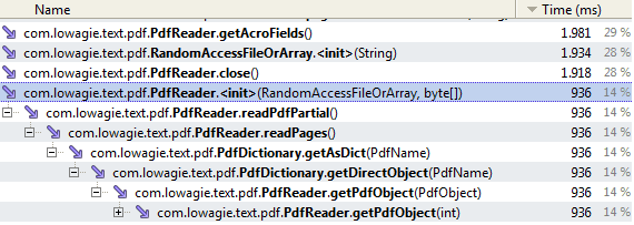 On a regular patrol through our AppDynamics monitoring on our continuously integrated projects, I found this interesting HotSpot in iText. iText , a previously free but now commercial java library, allows to parse PDFs easily by just using a PDFReader: