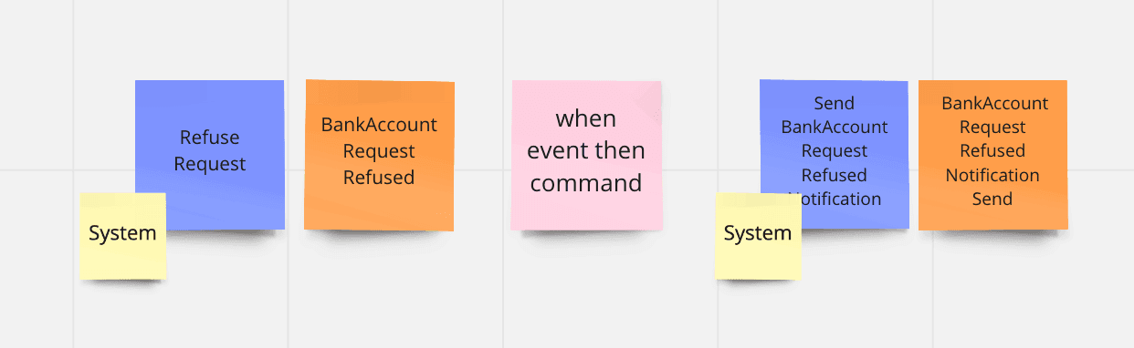 For example, when a bank account request is refused, we should always send a notification. The bank account request is refused is a domain event that happened. The sending of a notification to the user is the command of something that we want to happen. Let us explain the policy sticky. When Event then Command.