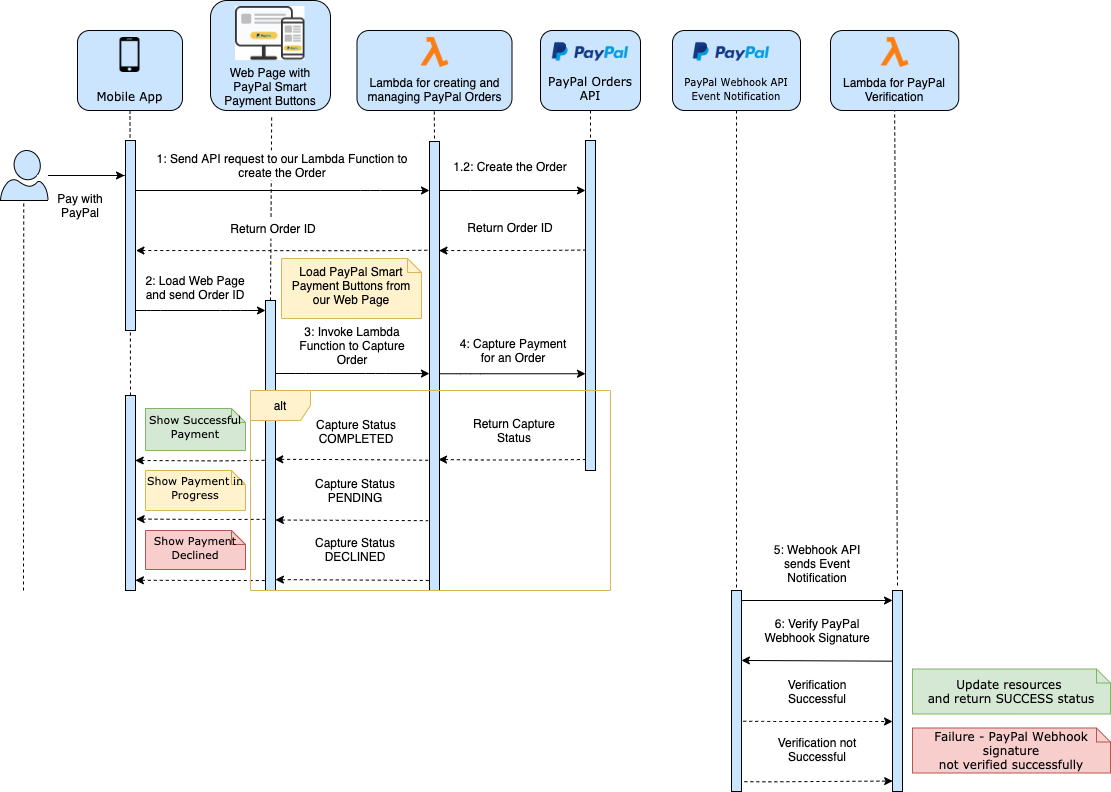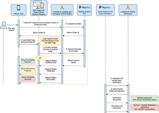 (6) Since PayPal signs every notification message that it delivers, one of the implementation requirements was to verify the signature of the incoming message (POST /v1/notifications/verify-webhook-signature) so that we know that notification is actually sent from the PayPal. If verification is successful, we are good to update our resources in the database based on the capture status.