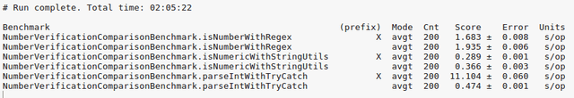Long story short, to try it out, I created a benchmark which compares different approaches to check if a String represents a valid Integer value. It compares following implementations: