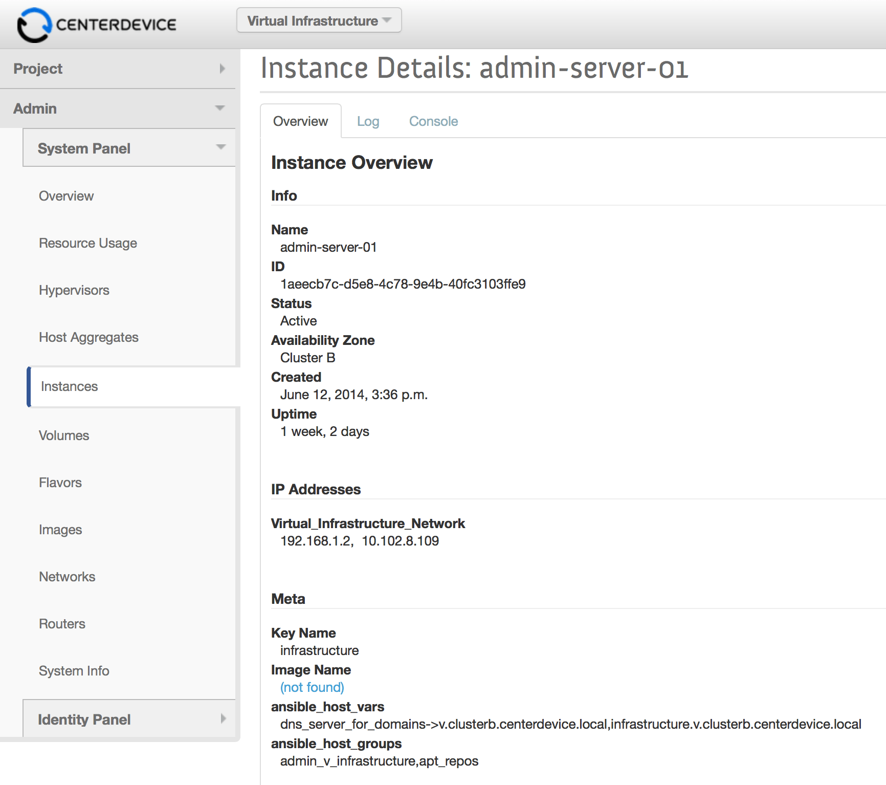 1nova boot --flavor m1.medium … --meta \ 2 ansible_host_vars=dns_server_for_domains->v.clusterb.centerdevice.local,\ 3 infrastructure.v.clusterb.centerdevice.local \ 4 --meta ansible_host_groups=admin_v_infrastructure