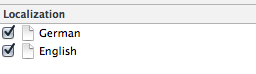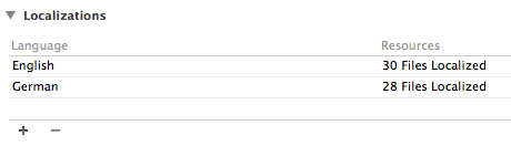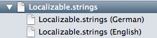 For each language you want to support there will be a separate copy of a .strings file. Those are plain (UTF-16) text files with key-value-mappings. The default name for Cocoa apps’ main localization table is simply Localizable.strings. If you do not do anything special, all your texts go into this file. You can also create more of them if you want to split up your texts in a more fine-grained manner. We will not use separate files in this blog post, but if you still want to know how to add and configure them, this is how: