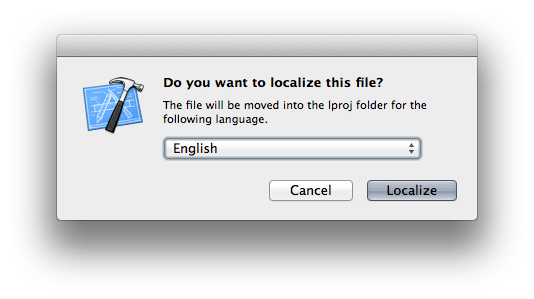 Just remember that in order for the NSShowNonLocalizedStrings argument to work, it modified the way the code behind NSLocalizedString works. What now if developers simply forgot to use NSLocalizedString in the first place? — Right: You would not notice at all while running the application. Creating the .strings files wiht either Linguan or genstrings would never pick up that alert dialog’s text if it was just a simple straight-forward string in your source code: