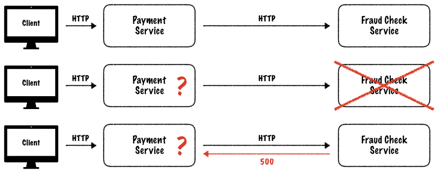 In this case our services offer HTTP based interfaces. To check the transaction, the payment service sends an HTTP request to the fraud check service. If everything works well, there will be a 200 response with the boolean indicating whether the transaction is fraudulent or not. But what if the fraud check service is not answering? What if it returns an internal server error (500)?