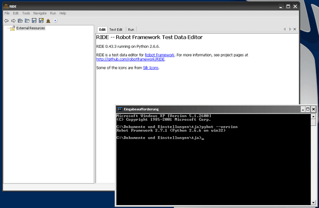 Just install the first five artefacts in the given order using the installers (I am using defaults for everything all the time). Then add the following part to your PATH variable: “C:\Python26;C:\Python26\Scripts”. Now you should be able to execute Robot Framework using “pybot –version” and to start RIDE from “C:\Python26\Scripts\ride.py”.