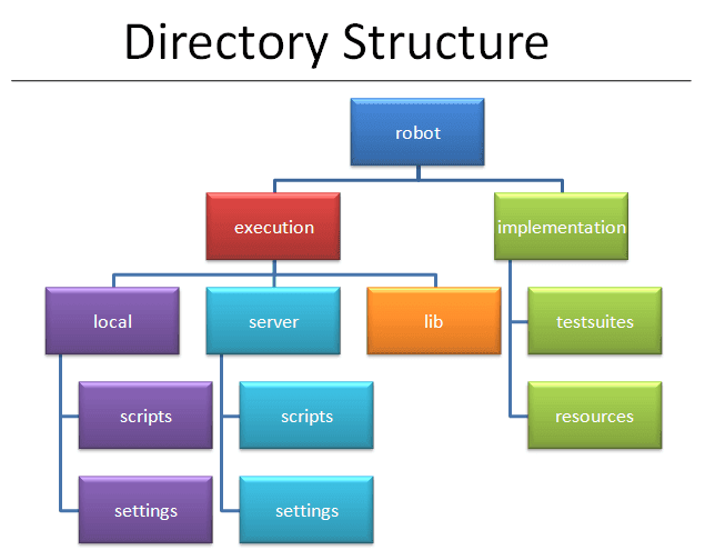 First of all we bundle everything below one top-level directory (robot). Then we distinguish between the implementation and the execution of the tests. On the implementation side all Testsuites go to the testsuites-directory and all Resource Files go to the, well I guess you guessed it already. Of course in some really big projects some additional sub-directories might be created to further structure the tests. What is really important that – when referencing any other files (e. g. Resource Files from Testsuites) – all path information is given only relative. This way it does not matter at all on which operating system and in which directory the top-level robot-directory is located. This is especially important as all these files are under some Source Control System and every team member might check out files to different locations.