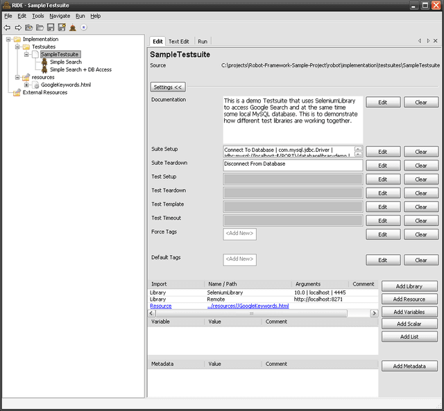 Luckily I have done this thinking already for a hypothetical SuT :-). Let’s imagine that this is a web application that makes use of some database (quite typical use case from my experience). To keep things as simple as possible the tested web application will be Google and the database will simply be a local MySQL database instance. Of course there is then no real relation between Google and this local database, but that does not matter for demonstrating the tests. What is more important is to show how to mix different Test Libraries (in this example SeleniumLibrary and DatabaseLibrary) and make use of the Remote Test Library feature of the DatabaseLibrary at the same time. I cannot really tell why, but I tend to use the Java version from the available database libraries .