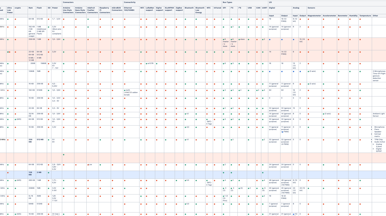 So this was my first task: Go through the list of generally supported development boards and to compile a table making it possible to compare devices with each other. For this I had to track down the specs of every device and the number of columns in my table kept on growing. In the end I had a list with 49 columns and 62 rows. I think this is the first time such a comparison table has been created and I’m currently working on my first contribution to the Apache MyNewt project by integrating this information into their website.