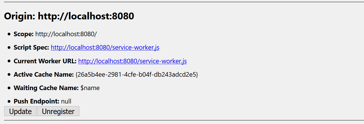 Another bit of unexpected behaviour of a service worker is that when a service worker script changes and the new version is fetched from the server, the new version won’t load immediately. The update will be done if you trigger it manually or when all browser tabs are closed. In Firefox you can go to ‘about:serviceworkers’. You will see the service worker registered below and you can manually force an update or unregister. This will not force an activation for this you need to do a hard refresh at least.