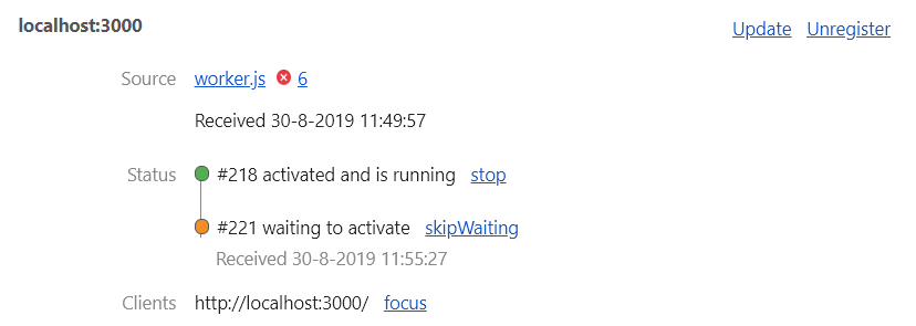 In Chrome, you can do a bit more to force activation of the service worker after an update. In the development tools it is possible to update and unregister the service worker by going to ‘Application’ and then ‘Service Workers’. The below state can be achieved when an update of the service worker is done and the service worker contains changes.