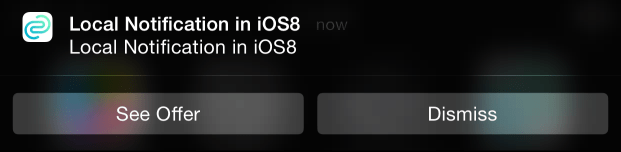1let checkAction = UNNotificationAction.init(identifier: "CheckId", title: "Check Offer", options: [.foreground]) 2let nextTimeAction = UNNotificationAction.init(identifier: "NextId", title: "Next Time", options: [.foreground]) 3let bubblegumCategory = UNNotificationCategory.init(identifier: "CategoryId", actions: [checkAction, nextTimeAction], intentIdentifiers: [], options: []) 4UNUserNotificationCenter.current().setNotificationCategories([self.bubblegumCategory!])