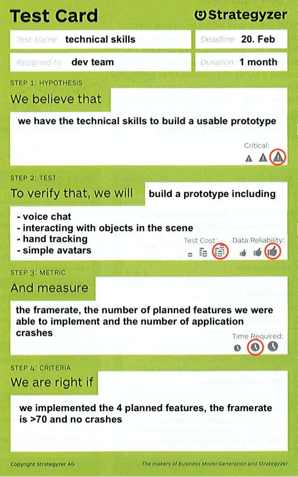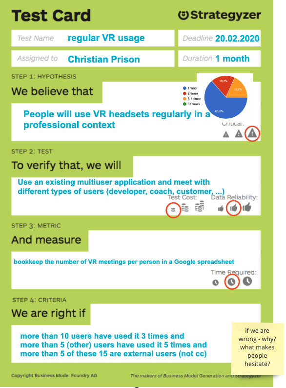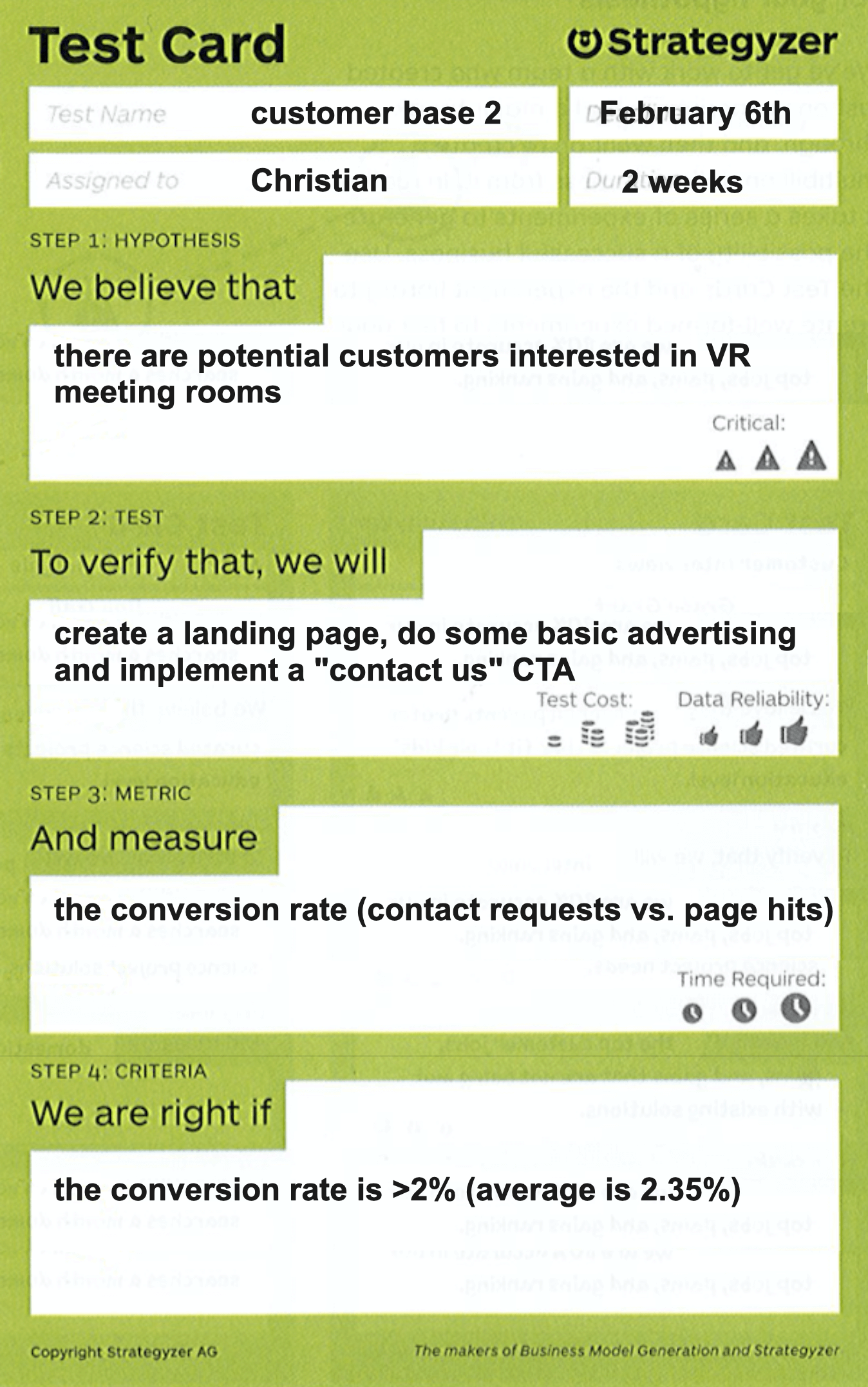 If this assumption would be wrong, we are in deep trouble 😉 Seriously: if we realize that people are not using VR regularly in a professional context, we need to act urgently. We already realized that the “pull” is not as tangible as we hoped. While we still believe that we can achieve the success criterion in the given time frame, we started focussing more on those contacts who have shown a major interest in our solution. How can we address their needs better? What problem are we solving for them? What gain does our solution have for them?