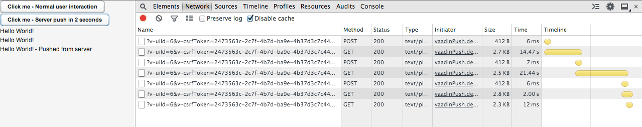 - With Long Polling you always have one long-running GET-Request to the server. The server doesn’t write the Response, unless the server has to transport something to the client. If you look at the screenshot, the 3rd Request (POST) sends the information “button clicked” to the server. The Response is send immediately without any data. vaadin now calls the ClickListener and sends the answer to the client through the long-running GET-Request (2nd line, was open for 14,47 seconds). The client now displays the changes and creates a new GET-Request for the next changes.