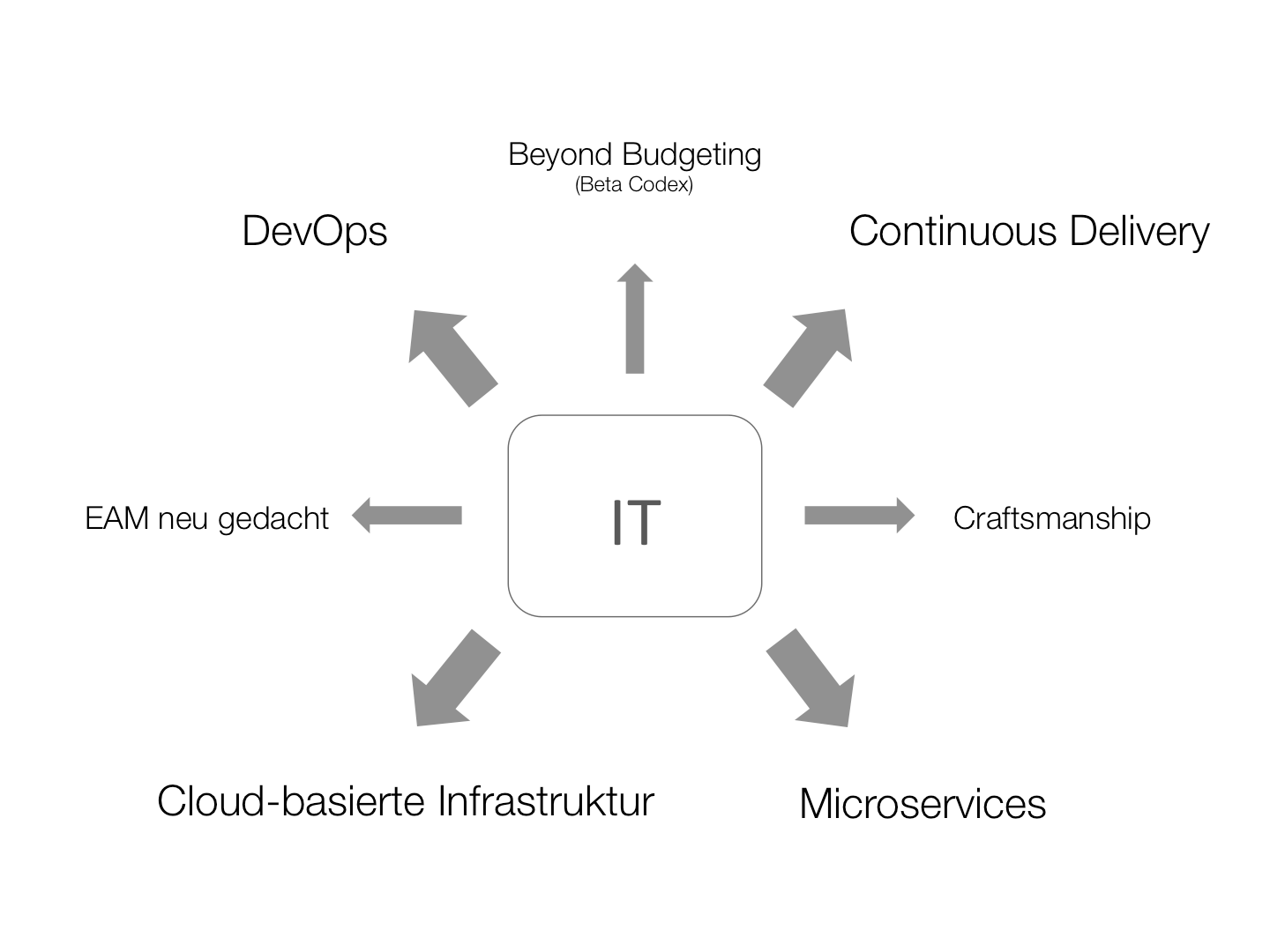 The core building blocks for this new IT are DevOps, microservices, continuous delivery and cloud computing which need to be augmented by some additional topics like EAM (also re-thought!), Beyond Budgeting and Craftsmanship.