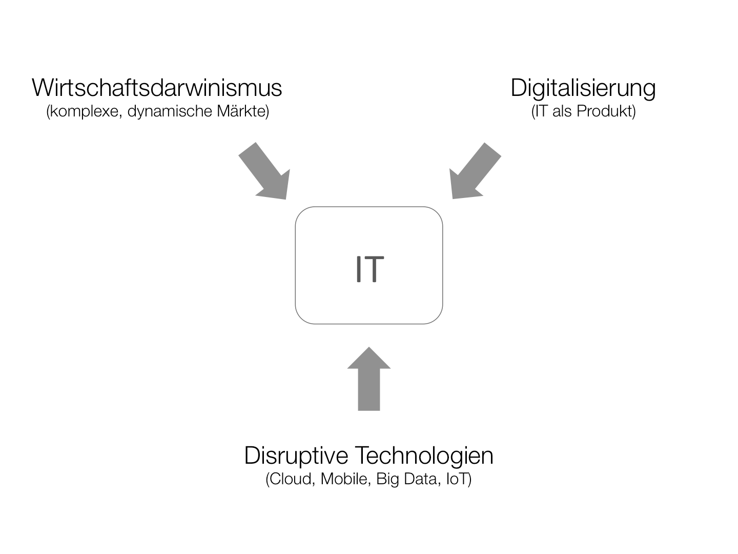 We need to re-think IT – the markets the companies live in have changed, IT itself has changed. The conditions in which our traditional IT models were developed do not exist anymore. Our main IT driver is not cost-efficient scaling of software production anymore, it is minimizing cycle times in order to maximize the company’s responsiveness.