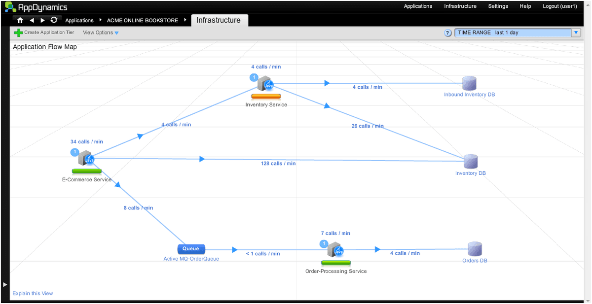 AppDynamics is a San Francisco based start-up that developed what they call a “next generation performance management tool”. It is designed from scratch by experienced APM engineers to support exactly these highly distributed SOA/Cloud production environments. AppDynamics can monitor a distributed Java EE application without the need of custom instrumentation or configuration. It automatically creates an application map (see screenshot) which shows the number of calls and response times of any interesting call like database-, webservice- or JMS calls. It also gives you a full call stack down to method level of any interesting business transaction. This is done by an “intelligent” rule base that utilizes statistics of your application to decide which information to show. This means you can get inside information of all of your applications in 15 minutes – this is the time to install the AppDynamics server and agent(s).