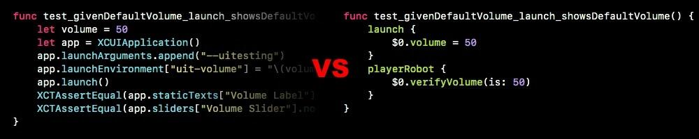 1playerRobot { 2 $0.setVolume(to: 10) 3 $0.verifyVolume(is: 10) 4}