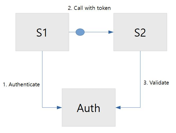 You have three services (S1, S2, Auth) with one service (S1) that wants to consume the output of the other service (S2). There is also an authentication service (Auth) that manages tokens and allows requests for a token. A token will be requested at the authentication service by S1, which allows an update of data in S2. S1 will identify itself, and the authentication service knows it can provide the token to S1 for updates and create calls on S2.